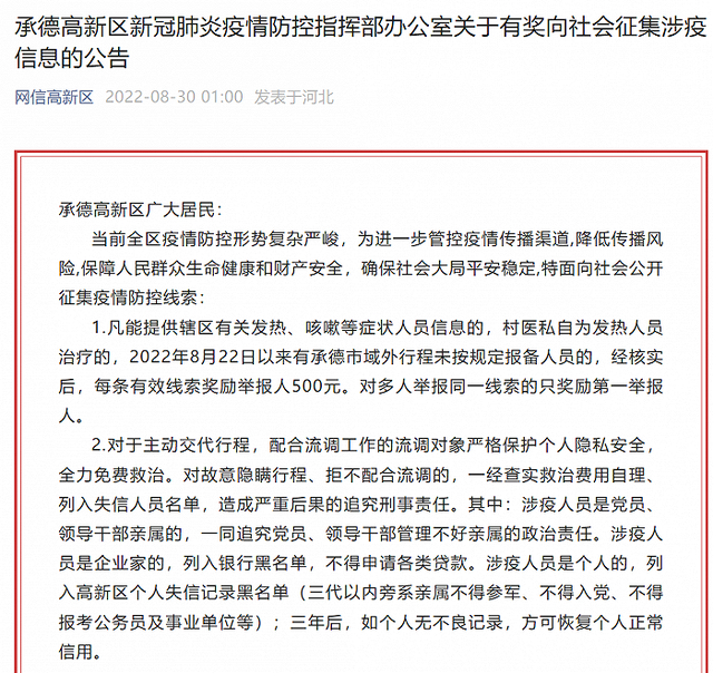 同日早前,“網(wǎng)信高新區(qū)”微信公眾號(hào)消息,承德高新區(qū)新冠肺炎疫情防控指揮部辦公室通告,當(dāng)前全區(qū)疫情防控形勢(shì)復(fù)雜嚴(yán)峻,為進(jìn)一步管控疫情傳播渠道,降低傳播風(fēng)險(xiǎn),保障人民群眾生命健康和財(cái)產(chǎn)安全,確保社會(huì)大局平安穩(wěn)定,特面向社會(huì)公開征集疫情防控線索: