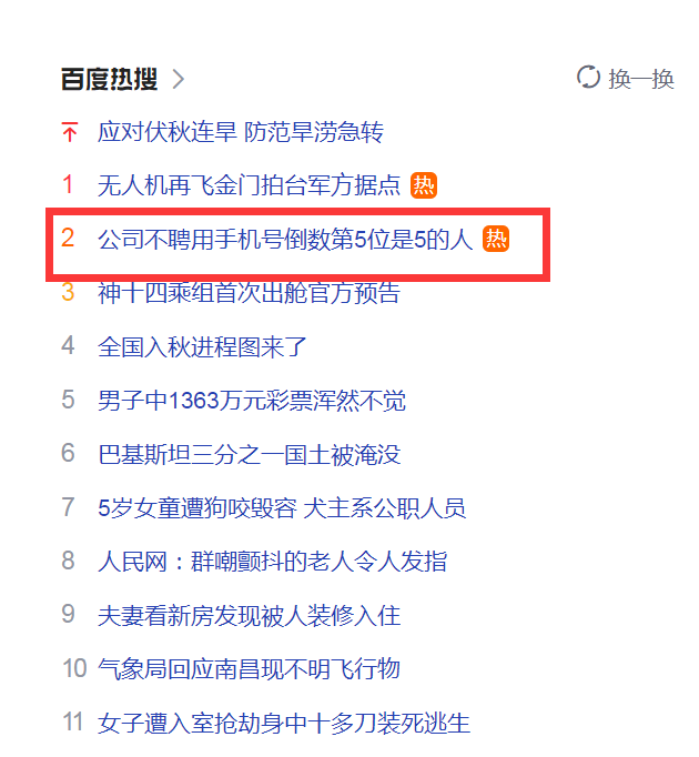 2022-09-01 08:45:17閱讀()互聯(lián)網(wǎng)又現(xiàn)就業(yè)歧視?8月31日?qǐng)?bào)道,近日,網(wǎng)傳深圳某教育公司招聘員工時(shí),要求手機(jī)倒數(shù)第五位數(shù)字不能為“5”引網(wǎng)友熱議,該新聞還登上了百度熱搜。