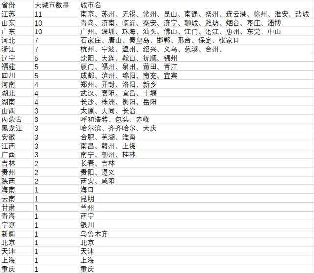 分省份來看,第二經(jīng)濟(jì)大省江蘇最多,達(dá)到11個,包括10個設(shè)區(qū)市和昆山這個縣級市,其省會城市南京的城區(qū)人口達(dá)791.5萬人,處于特大城市行列。
