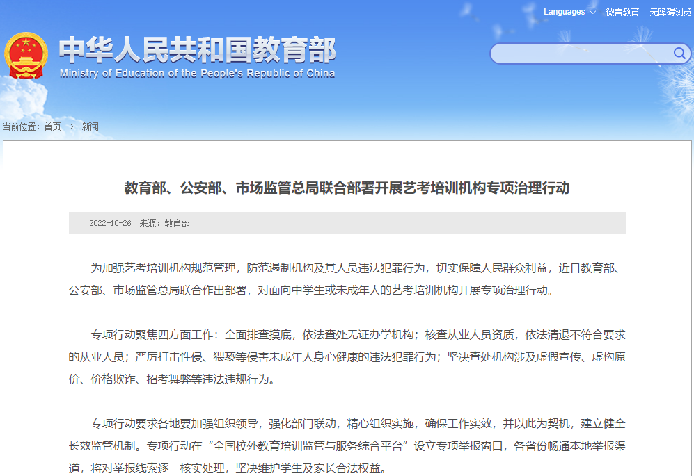 2022-10-27 09:43:03閱讀()央廣網(wǎng)10月26日,據(jù)教育部了解到,為加強(qiáng)藝考培訓(xùn)機(jī)構(gòu)規(guī)范管理,防范遏制機(jī)構(gòu)及其人員違法犯罪行為,切實(shí)保障人民群眾利益,近日教育部、公安部、市場(chǎng)監(jiān)管總局聯(lián)合作出部署,對(duì)面向中學(xué)生或未成年人的藝考培訓(xùn)機(jī)構(gòu)開(kāi)展專(zhuān)項(xiàng)治理行動(dòng)。