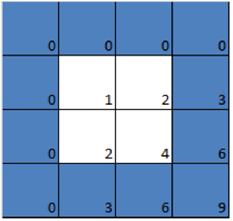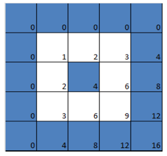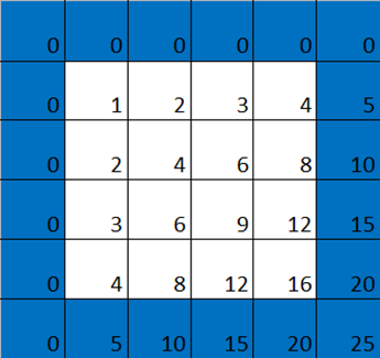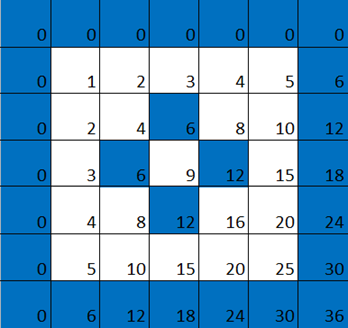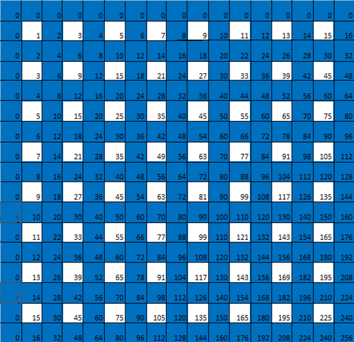 我們在表格的頂部和左側各添加一行 / 列 0,仍然是一個乘法表,只是便于我們看出下面的一些圖案。