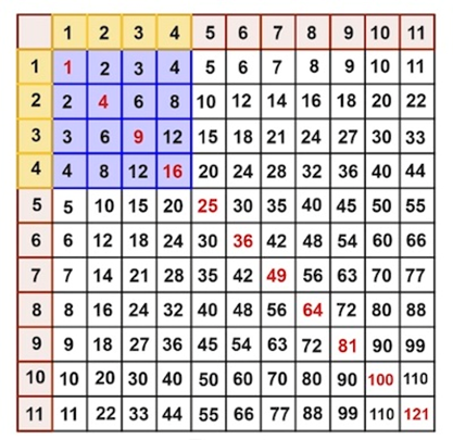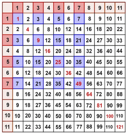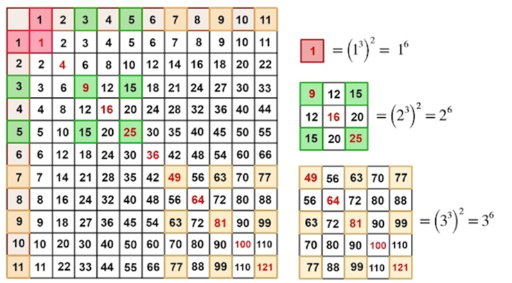 在整數(shù)的海洋中,乘法表主對角線(從西北角到東南角)上的紅色數(shù)字顯然是平方數(shù) —— 整數(shù)的 2 次方。