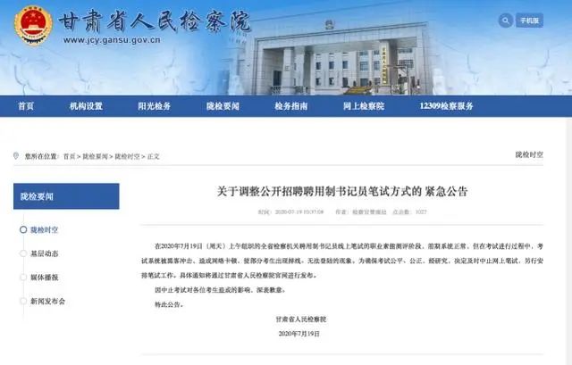 為確??荚嚬?、公正,經(jīng)研究,決定及時(shí)中止網(wǎng)上筆試,另行安排筆試工作。具體通知將通過甘肅省人民檢察院官網(wǎng)進(jìn)行發(fā)布。因中止考試對(duì)各位考生造成的影響,深表歉意。