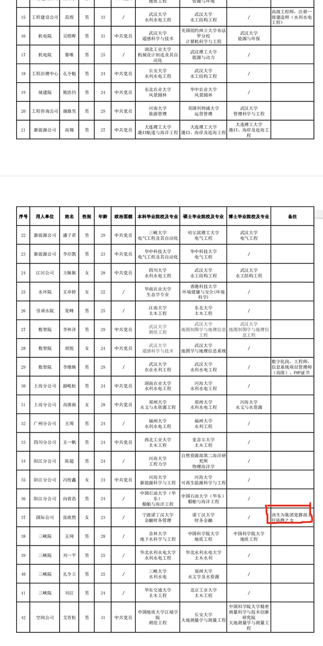 2023-02-08 14:29:07閱讀()大皖新聞2月7日,記者關(guān)注到,長江設(shè)計(jì)集團(tuán)有限公司于2023年2月2日發(fā)布了長江設(shè)計(jì)集團(tuán)2023年第三批擬聘人員信息公示,在公示表中記者看到該集團(tuán)國際公司招聘人員張欣然的公示信息中,專門備注“該生為集團(tuán)黨群部主任陳靜之女”。
