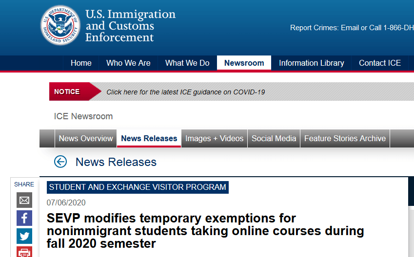 本月6日,ICE出臺新規(guī)稱,如果所在大學(xué)2020年秋季學(xué)期采取全面網(wǎng)上授課,這些學(xué)校的所有國際學(xué)生將不會獲得赴美簽證,已在美國境內(nèi)者需離境。