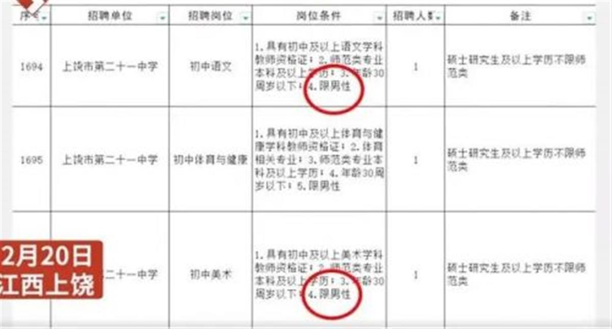 江西一中學多崗位只招男性,校方回應:是特殊教育學校,男老師方便管理