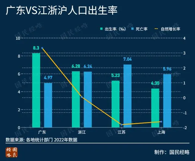 從出生率來看,2022年,廣東人口出生率達8.3‰,而整個長三角出生率最高的安徽僅為7.16‰,江蘇、上海兩地更是降到了5.23‰、4.35‰。