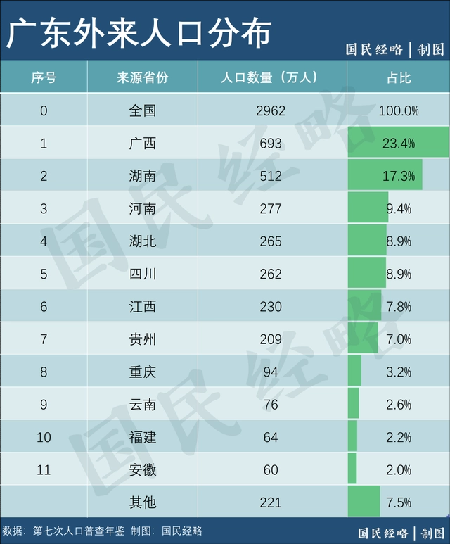 七普數(shù)據(jù)顯示,廣東外來人口總規(guī)模高達2962萬人,占總人口的1/4左右。這些外來人口,多數(shù)來自廣西、湖南、湖北、河南、四川、江西、貴州等省份。