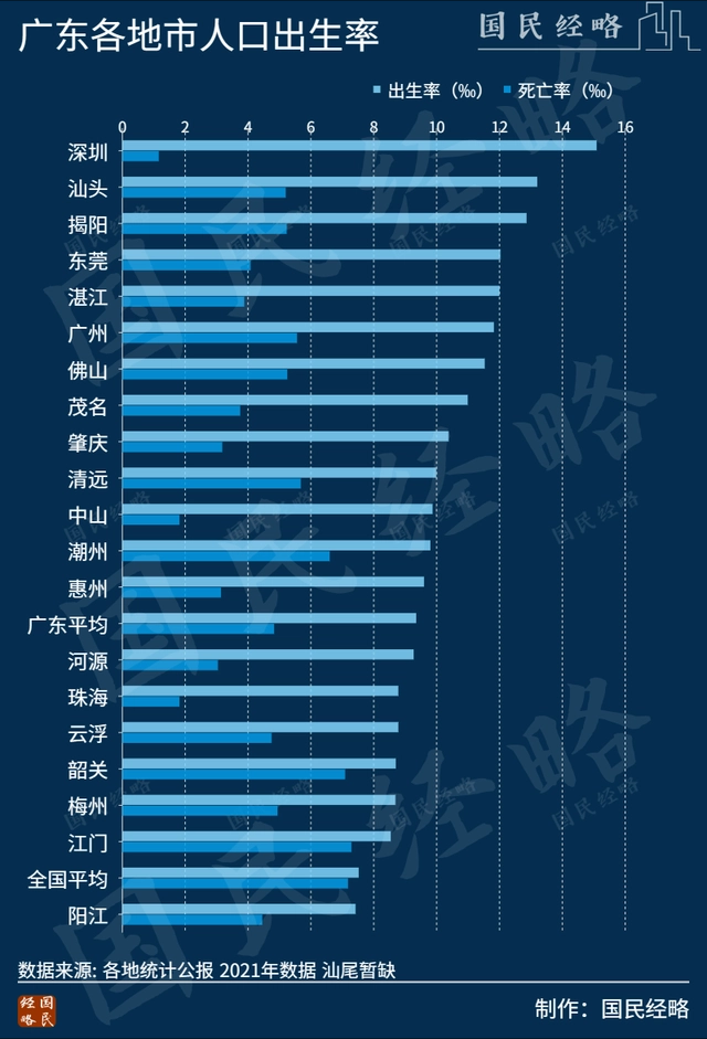 在廣東,出生率最高的5個城市分別是深圳、汕頭、揭陽、東莞、湛江,其中深圳以15‰位居全省之首。