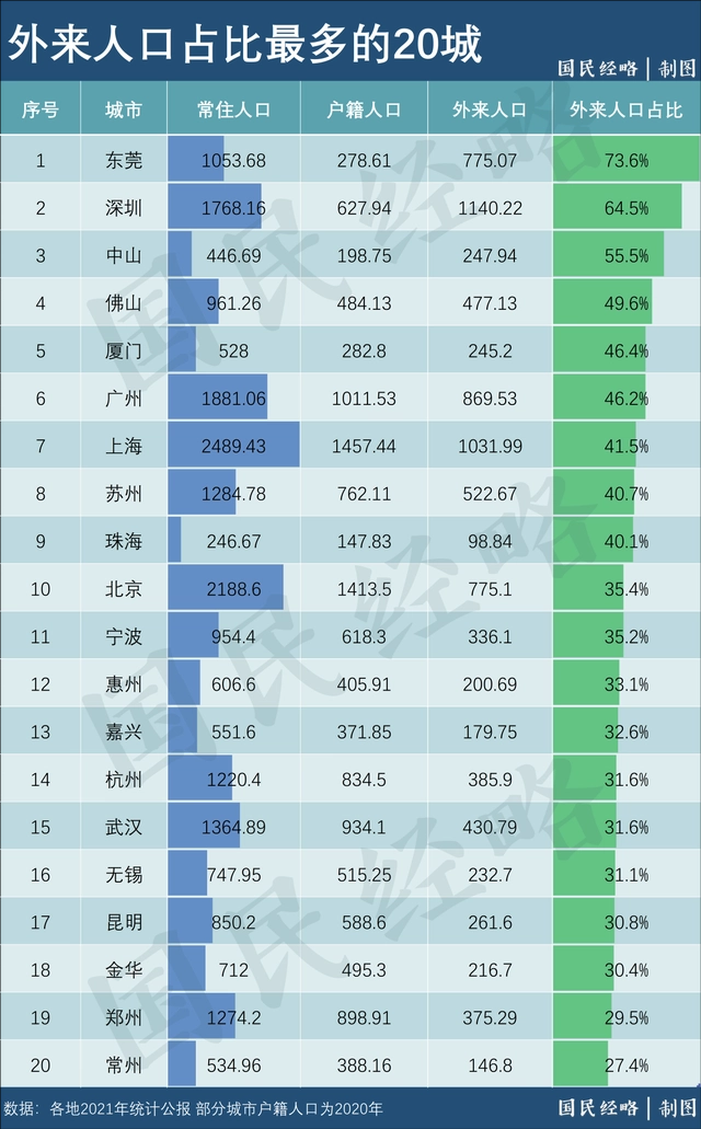 這其中最突出的當屬東莞。東莞常住人口已經(jīng)突破千萬大關,但戶籍人口僅有200多萬人,外來人口占比高達75%以上,為全國最高。