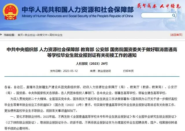 2023-05-13 09:47:19閱讀()人民政協(xié)網(wǎng)據(jù)人社部網(wǎng)站消息,日前中共中央組織部、人力資源社會(huì)保障部、教育部、公安部、國(guó)務(wù)院國(guó)資委發(fā)布《關(guān)于做好取消普通高等學(xué)校畢業(yè)生就業(yè)報(bào)到證有關(guān)銜接工作的通知》(以下簡(jiǎn)稱《通知》)。《通知》明確,2023年起,不再發(fā)放《全國(guó)普通高等學(xué)校本??飘厴I(yè)生就業(yè)報(bào)到證》和《全國(guó)畢業(yè)研究生就業(yè)報(bào)到證》(以下統(tǒng)稱“就業(yè)報(bào)到證”),取消就業(yè)報(bào)到證補(bǔ)辦、改派手續(xù),不再將就業(yè)報(bào)到證作為辦理高校畢業(yè)生招聘錄用、落戶、檔案接收轉(zhuǎn)遞等手續(xù)的必需材料。