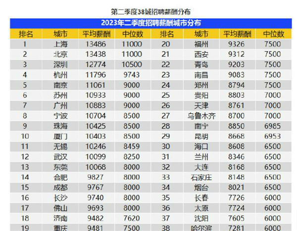 2023-07-13 17:12:34閱讀()智聯(lián)招聘近日,智聯(lián)招聘發(fā)布了2023年第二季度《中國企業(yè)招聘薪酬報告》,38座城市的企業(yè)平均招聘薪酬為10266元,環(huán)比上漲1.6%,但同比下降0.7%;中位數(shù)為8001元,環(huán)比持平,同比減少251元。