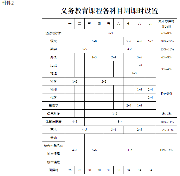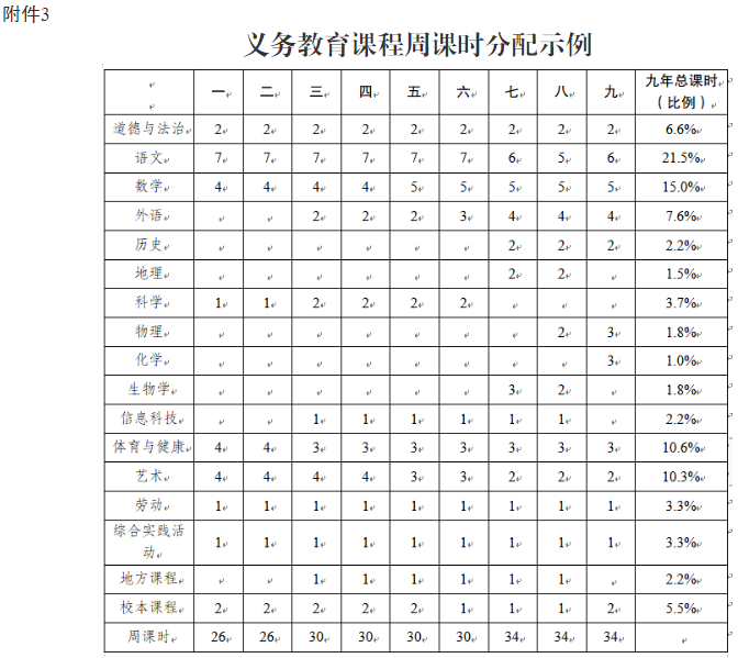 各級(jí)教育行政部門和義務(wù)教育學(xué)校應(yīng)嚴(yán)格落實(shí)國(guó)家課程方案要求,開齊開足國(guó)家課程,特別是信息科技、體育與健康、藝術(shù)、勞動(dòng)、綜合實(shí)踐活動(dòng)等課程,不隨意增減、占用課時(shí)。各科目安排及占九年總課時(shí)比例見附件1。勞動(dòng)、綜合實(shí)踐活動(dòng)課程自2022年秋季一至九年級(jí)開始執(zhí)行,信息科技課程自2023年秋季三至八年級(jí)開始執(zhí)行,其他學(xué)科自2024年秋季一年級(jí)、七年級(jí)開始執(zhí)行,確保各科目在相應(yīng)年級(jí)的總課時(shí)數(shù)達(dá)到要求。課程比例設(shè)置和周課時(shí)分配示例見附件2、附件3。