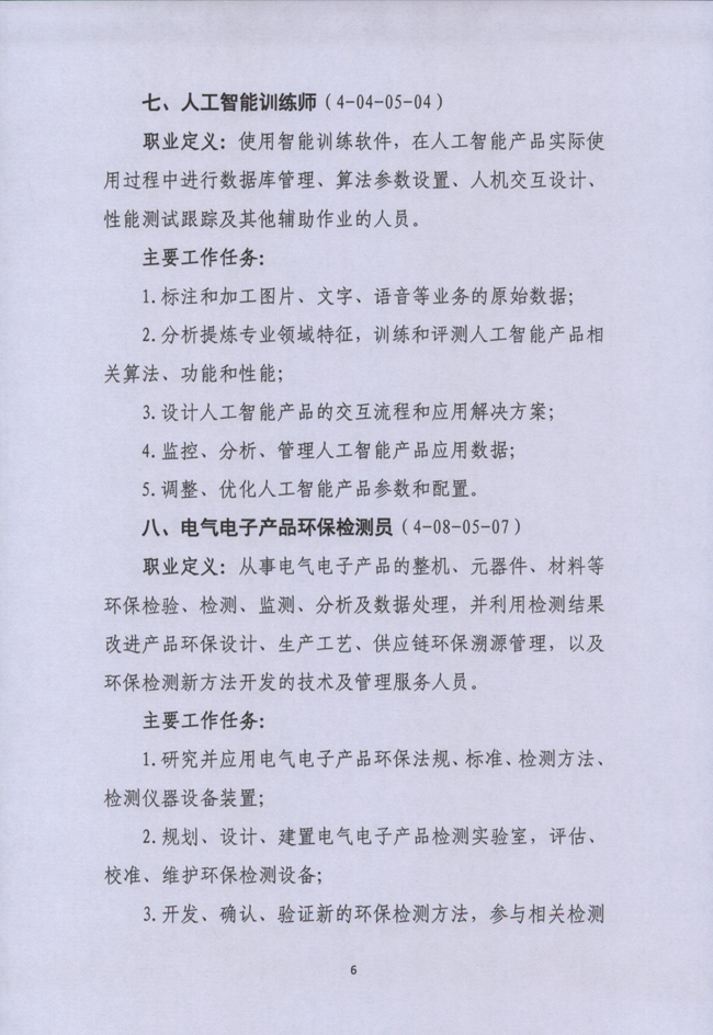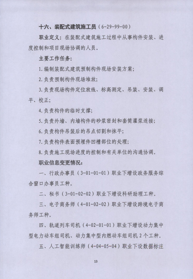 據(jù)了解,16個(gè)新職業(yè)為智能制造工程技術(shù)人員、工業(yè)互聯(lián)網(wǎng)工程技術(shù)人員、虛擬現(xiàn)實(shí)工程技術(shù)人員、連鎖經(jīng)營(yíng)管理師、供應(yīng)鏈管理師、網(wǎng)約配送員、人工智能訓(xùn)練師、電氣電子產(chǎn)品環(huán)保檢測(cè)員、全媒體運(yùn)營(yíng)師、健康照護(hù)師、呼吸治療師、出生缺陷防控咨詢師、康復(fù)輔助技術(shù)咨詢師、無(wú)人機(jī)裝調(diào)工、高鐵線路綜合維修工和裝配式建筑施工員。
