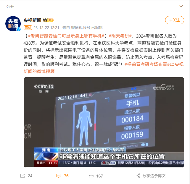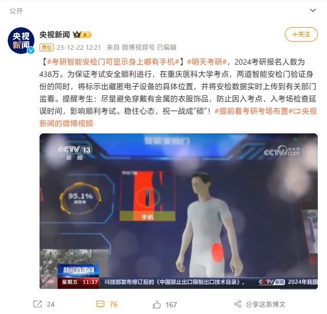 多地考研入場(chǎng)新增智能安檢門:可標(biāo)示藏匿電子設(shè)備具體位置,并實(shí)時(shí)上傳數(shù)據(jù)