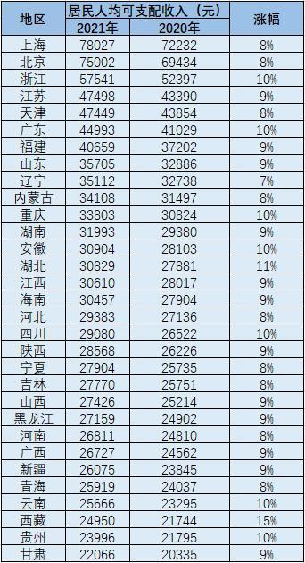 31省份2021年居民人均可支配收入數(shù)據(jù)出爐上海北京均超7萬元