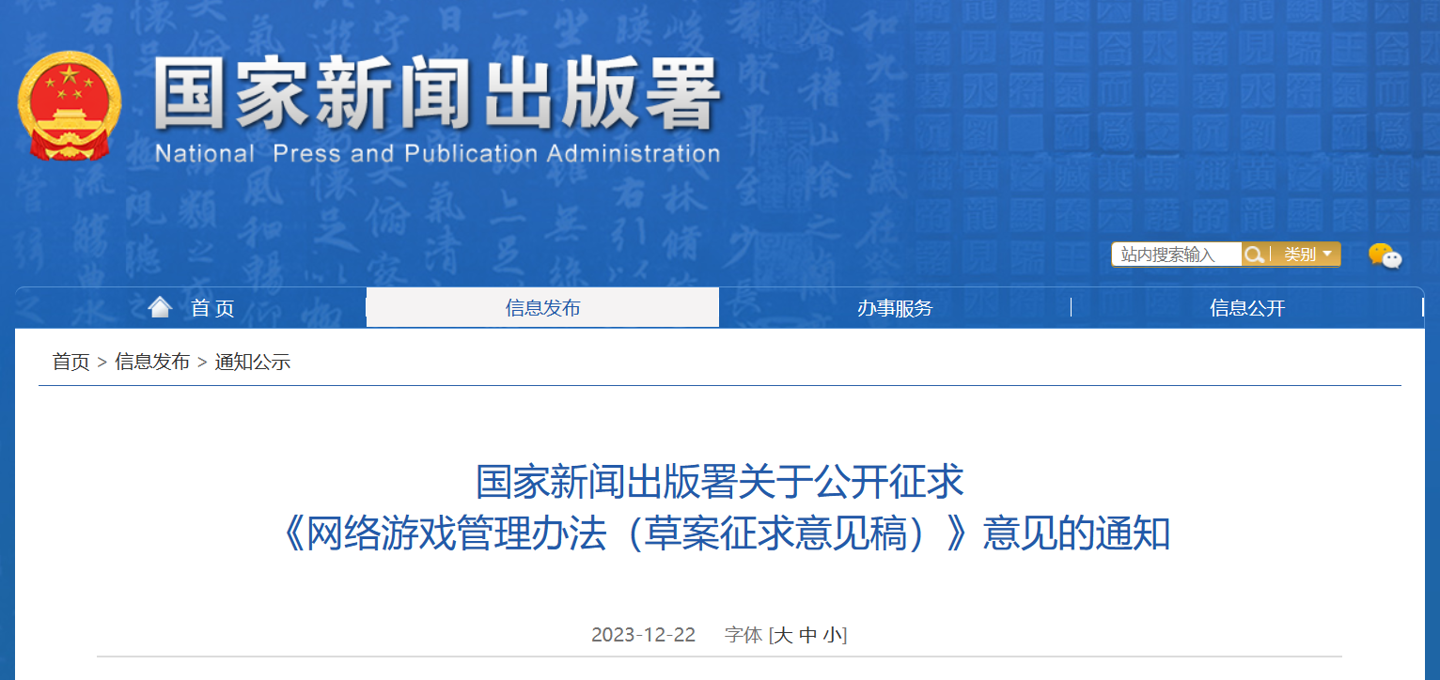 12月22日消息,國(guó)家新聞出版署今日發(fā)布《網(wǎng)絡(luò)游戲管理辦法(草案征求意見(jiàn)稿)》,現(xiàn)向社會(huì)公開(kāi)征求意見(jiàn)。文件中提到,網(wǎng)絡(luò)游戲不得設(shè)置每日 ...