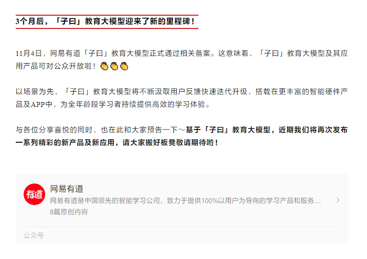 網(wǎng)易有道“子曰”教育大模型通過相關(guān)備案,將對公眾開放