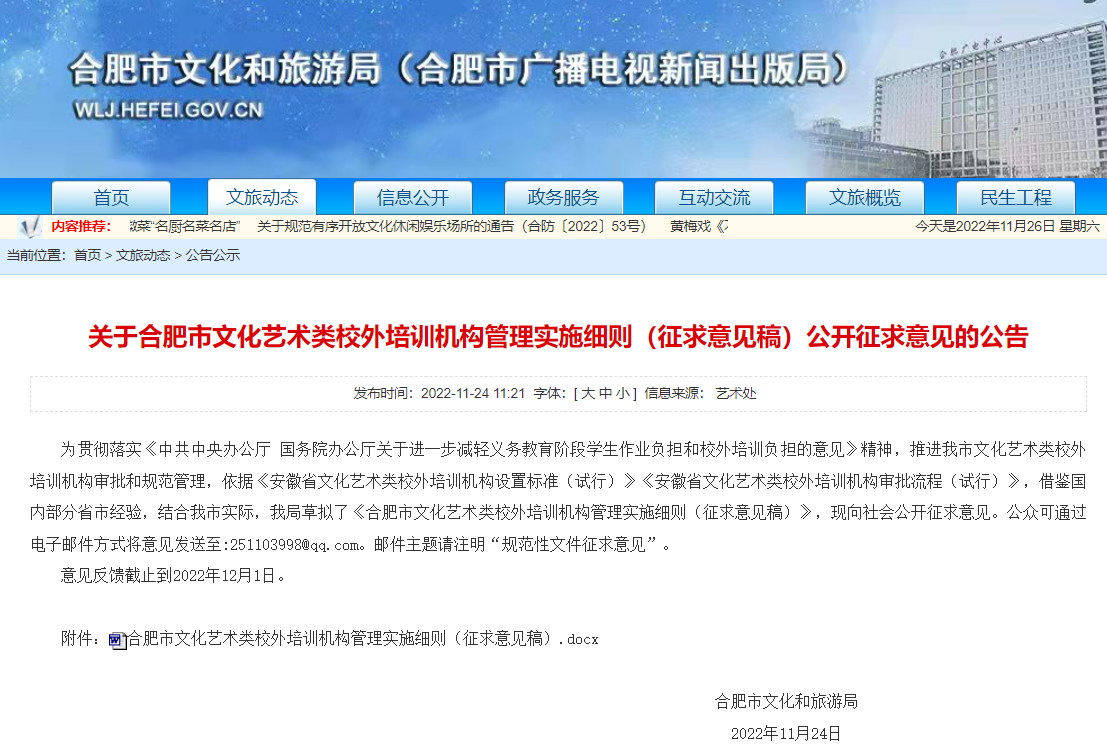 據(jù)合肥市文化和旅游局官網(wǎng)11月24日消息為貫徹落實《中共中央辦公廳國務院辦公廳關(guān)于進一步減輕義務教育階段學生作業(yè)負擔和校外培訓負擔的意 ...