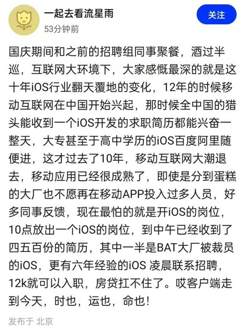 最近在手機某公眾號看到一篇文章《IOS大裁員,一半來自BAT大廠開發(fā)》。里面的截圖如下:其實這不是現(xiàn)在才有的現(xiàn)象,早在十年前,據(jù)有關(guān)平臺 ...