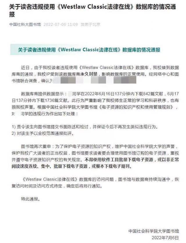 中國社會科學院大學圖書館近日發(fā)布通報稱,由于該校讀者違規(guī)使用《WestlawClassic法律在線》數(shù)據(jù)庫,該校接到數(shù)據(jù)庫商的通報,學校IP受到該 ...