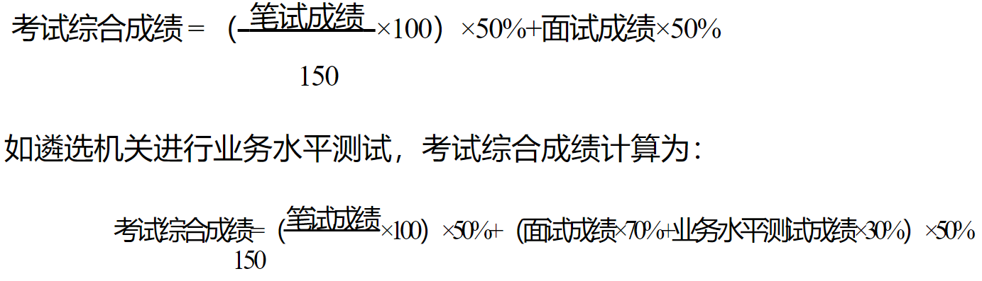 面試結束后,各遴選、選調機關及時公布考試綜合成績??荚嚲C合成績由筆試和面試成績組成,總分為100分,其中,筆試、面試成績各占50%。如進行業(yè)務水平測試的,業(yè)務水平測試成績占面試成績的30%。根據總成績排名從高到低,按照規(guī)定比例確定考察和體檢人選。具體計算公式如下:
