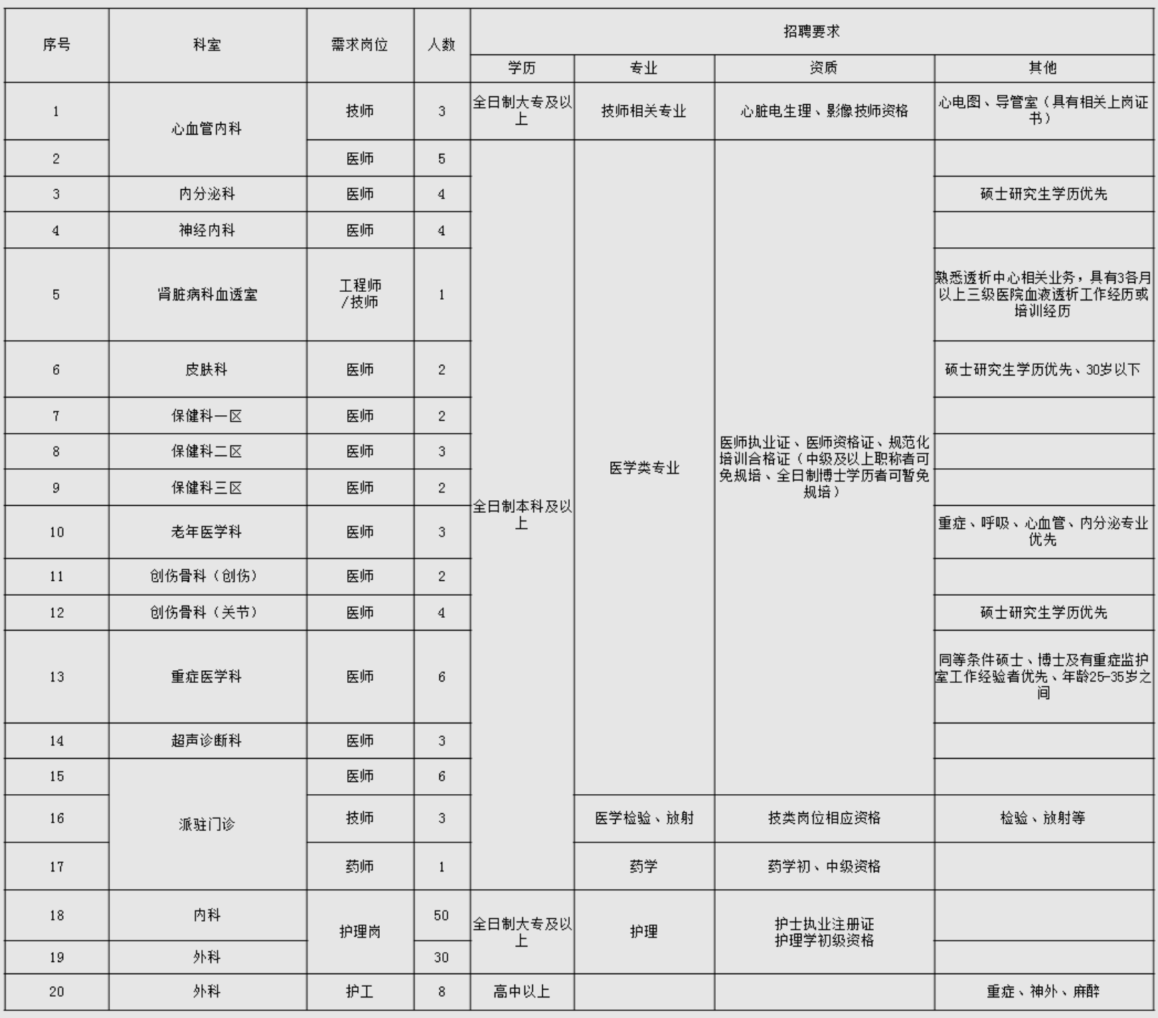 根據(jù)醫(yī)院發(fā)展需要,現(xiàn)面向社會(huì)招聘醫(yī)、藥、護(hù)、技、工程等類(lèi)別人員,有臨床工作經(jīng)驗(yàn)者優(yōu)先。