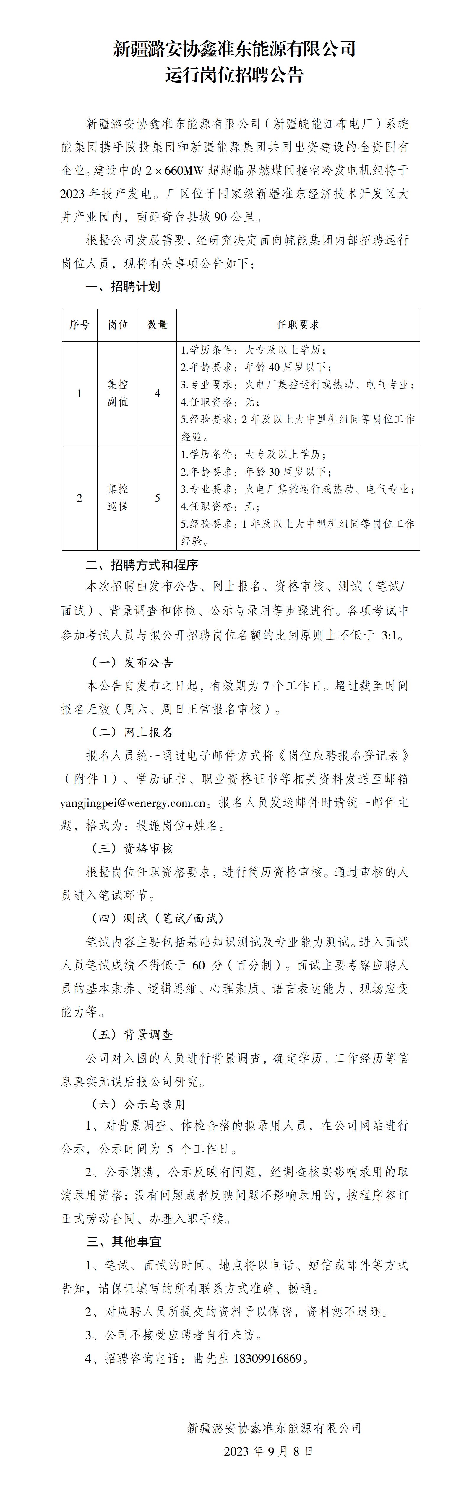 2023年新疆潞安協(xié)鑫準(zhǔn)東能源有限公司運(yùn)行崗位招聘公告