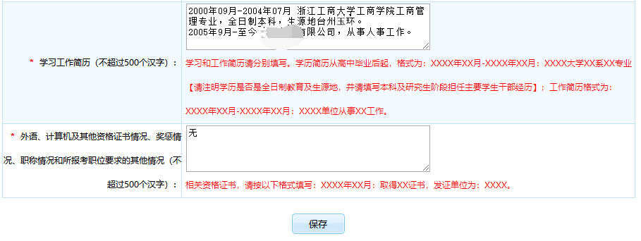 提醒:考生應(yīng)逐條填寫完整的學(xué)習(xí)、工作簡(jiǎn)歷(請(qǐng)從高中開(kāi)始逐一填寫至2022.4止,不要存有斷檔時(shí)限)。招聘崗位要求全日制學(xué)歷的,請(qǐng)?jiān)趯W(xué)習(xí)簡(jiǎn)歷填寫時(shí)注明是否是全日制教育;部分崗位要求2022年普通高校應(yīng)屆畢業(yè)生的,請(qǐng)?jiān)趯W(xué)習(xí)簡(jiǎn)歷中注明畢業(yè)時(shí)間;部分崗位要求職業(yè)(資格)證書的,請(qǐng)務(wù)必在其他情況中按正確的格式如實(shí)填寫完整詳細(xì)的信息。