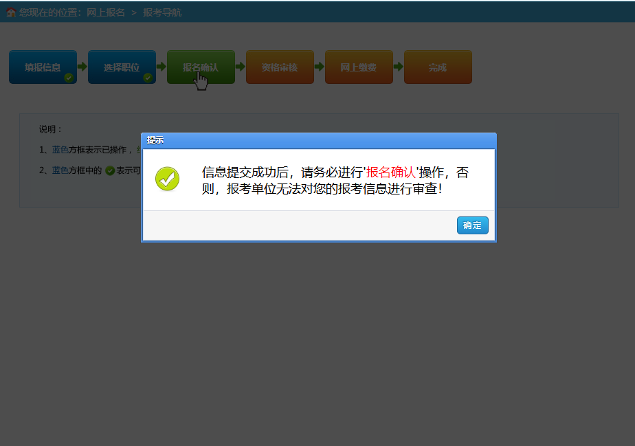 報(bào)考人員報(bào)名信息提交后,請(qǐng)務(wù)必進(jìn)行“報(bào)名確認(rèn)”操作,否則,報(bào)考單位無(wú)法進(jìn)行資格審查。