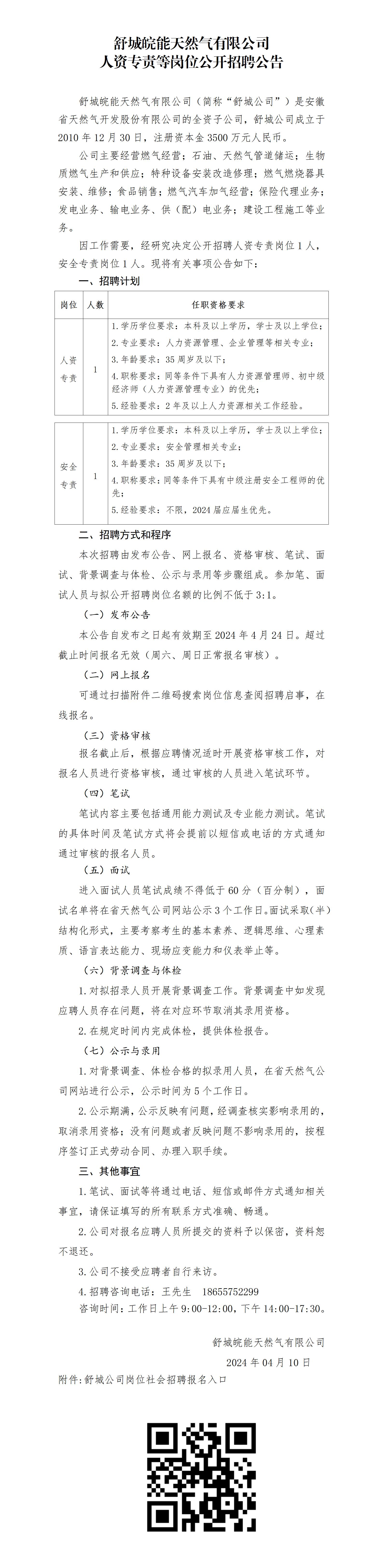 2024年六安舒城皖能天然氣有限公司人資專責等崗位公開招聘公告