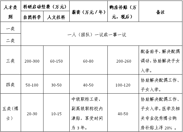 1、對于全職引進的博士及以上高層次人才,按照《皖南醫(yī)學院引進高層次人才實施辦法(修訂)》(校政[2018]191號)(http://rsc.wnmc.edu.cn/63/10/c1981a90896/page.htm)提供購房補貼、安家費、科研啟動經(jīng)費等。標準如下:
