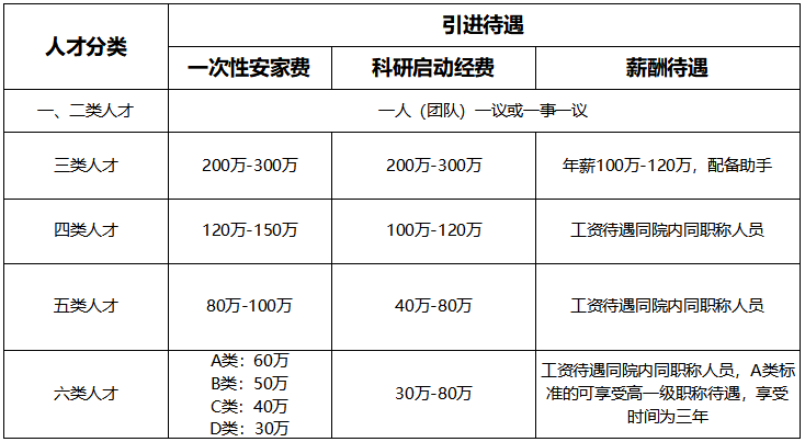 積極鼓勵(lì)引進(jìn)人才團(tuán)隊(duì),實(shí)行“一事一策”,團(tuán)隊(duì)成員按同層次人才上浮 10% 享受待遇;團(tuán)隊(duì)科研啟動(dòng)經(jīng)費(fèi)300-600 萬元?;虬凑?qǐng)F(tuán)隊(duì)人才類型對(duì)應(yīng)的科研啟動(dòng)經(jīng)費(fèi)累計(jì)計(jì)發(fā)。