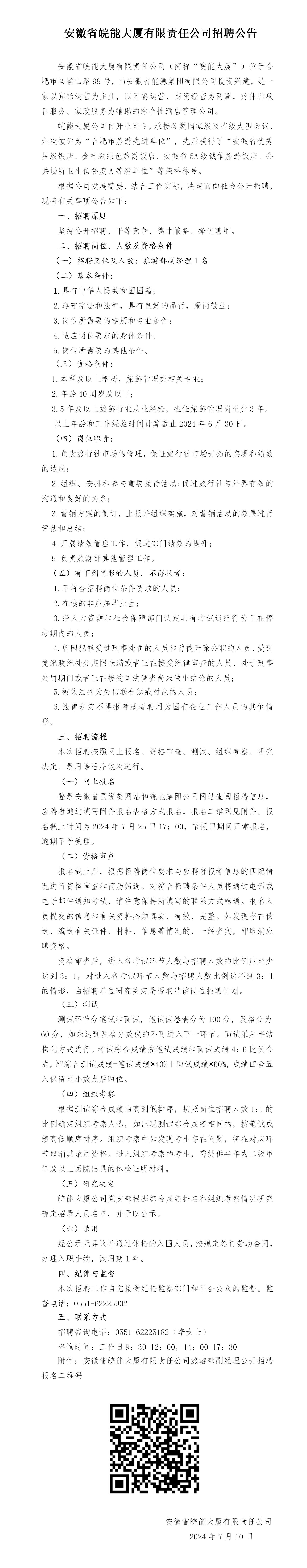 2024年安徽省皖能大廈有限責任公司招聘公告
