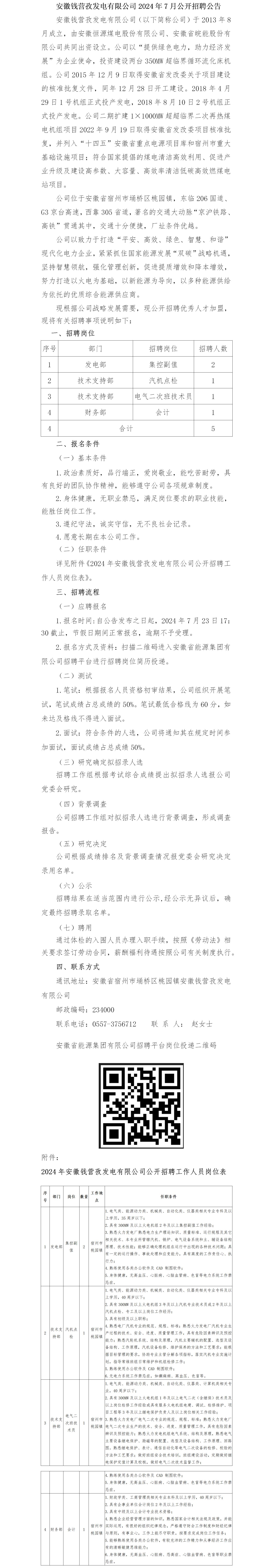 2024年宿州安徽錢營孜發(fā)電有限公司公開招聘公告