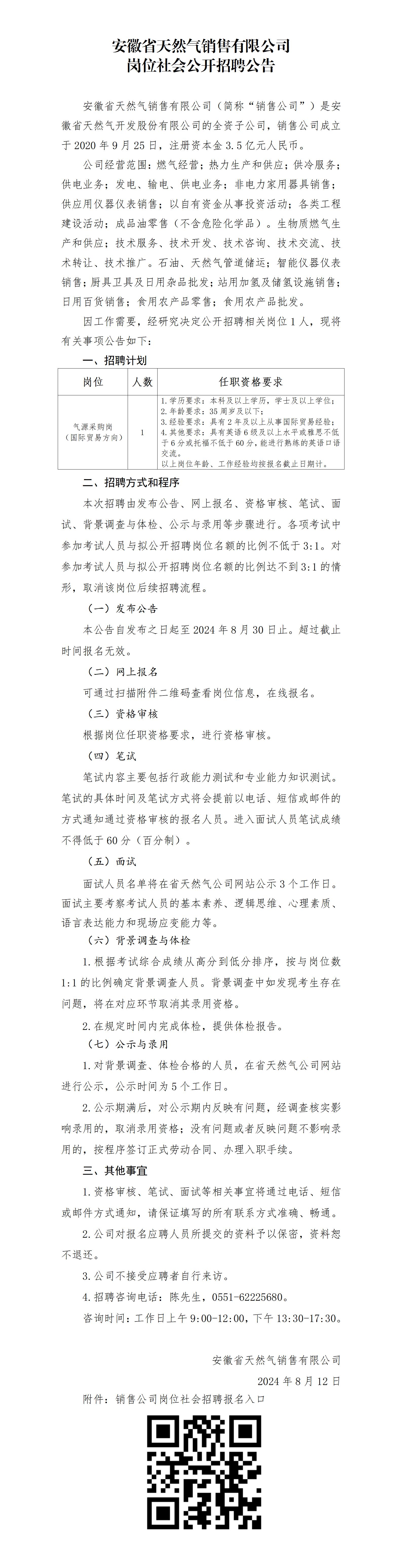2024年安徽省天然氣銷(xiāo)售有限公司崗位社會(huì)公開(kāi)招聘公告