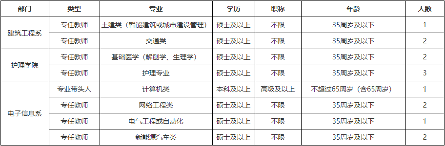 1、專業(yè)、學(xué)歷、職稱條件詳見表格,有職稱、教學(xué)經(jīng)驗或有企業(yè)工作經(jīng)歷并取得職業(yè)資格證書者優(yōu)先。