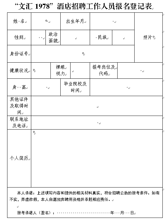 報名時提交①本人有效居民身份證、②學歷證書、③有效的無犯罪記錄證明、④各類專業(yè)證書、職稱證書的原件及填寫好的《“文匯1978”酒店招聘工作人員報名登記表》(貼近期1寸免冠證件照片)的原件及復印件。