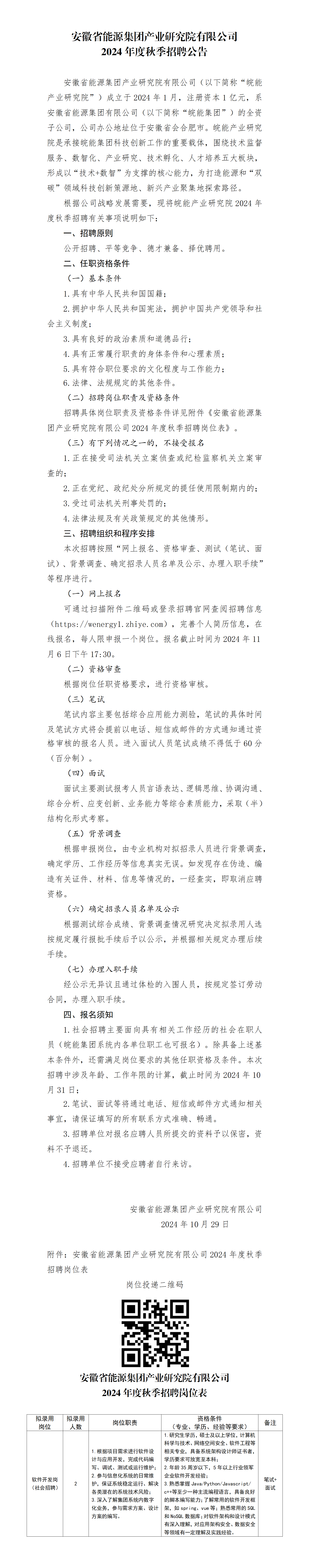 根據公司戰(zhàn)略發(fā)展需要,現將皖能產業(yè)研究院2024年度秋季招聘有關事項說明如下: