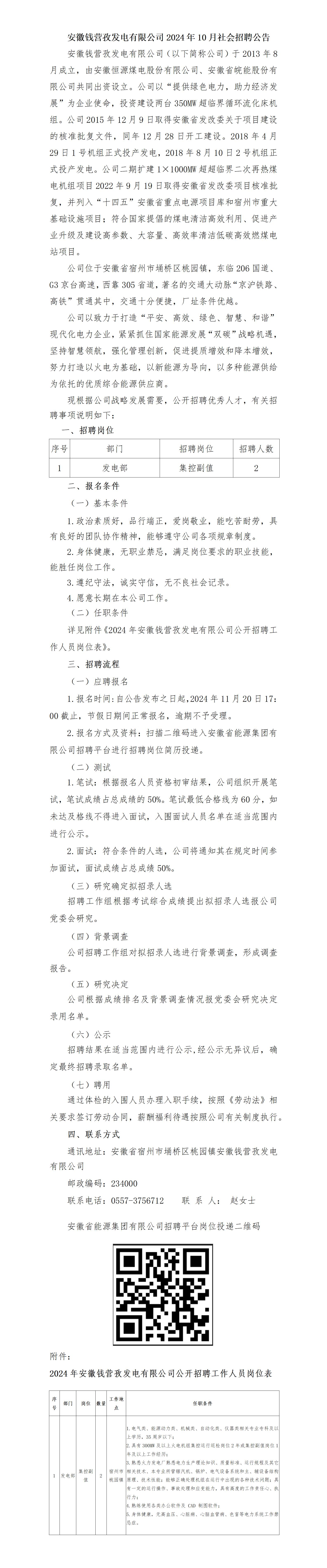 2024年宿州安徽錢營(yíng)孜發(fā)電有限公司社會(huì)招聘公告