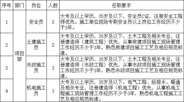 蚌埠城投建工有限公司是蚌埠市城市投資控股集團(tuán)有限公司全資子公司,成立于2022年7月,注冊(cè)資本5000萬(wàn)元。具有建筑工程施工總承包、市政公用工程施工總承包雙二級(jí)資質(zhì),主營(yíng)業(yè)務(wù)包括建設(shè)工程施工、園林綠化工程施工、電氣安裝服務(wù)、施工專(zhuān)業(yè)作業(yè)、建筑勞務(wù)分包、市政設(shè)施管理、建筑材料經(jīng)營(yíng)、銷(xiāo)售等。結(jié)合實(shí)際工作需要,經(jīng)研究決定,招聘勞務(wù)派遣8人。