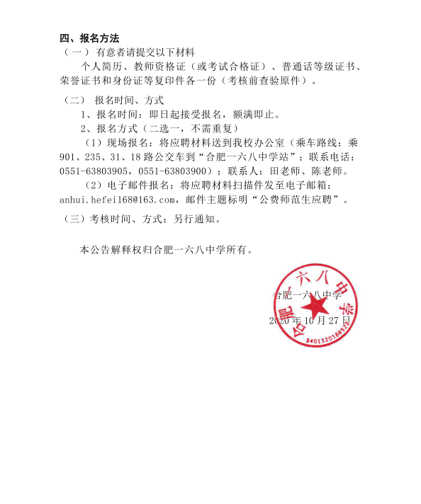 (2)電子郵件報(bào)名:將應(yīng)聘材料掃描件發(fā)至電子郵箱:anhui.hefei168@163.com,郵件主題標(biāo)明“公費(fèi)師范生應(yīng)聘”。