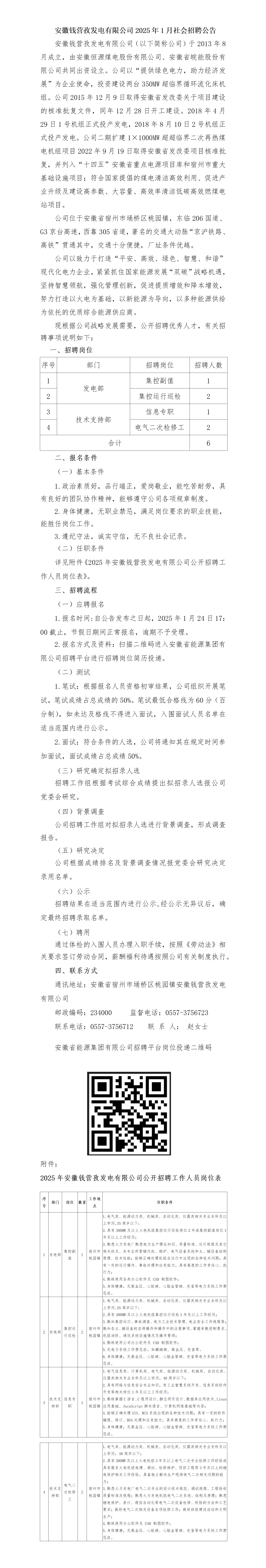 2025年安徽錢營孜發(fā)電有限公司1月社會招聘公告