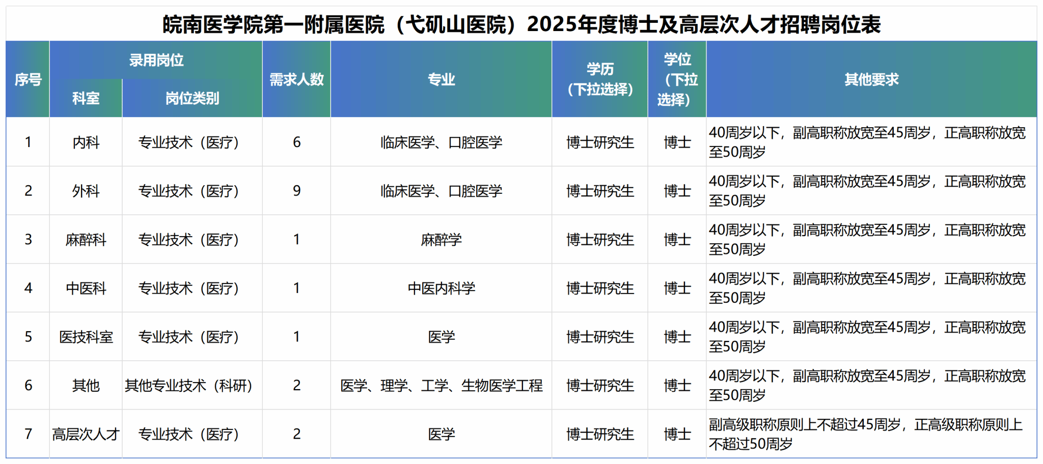 (五)年齡條件:原則上博士畢業(yè)生40周歲以下,具有副高級職稱的人員年齡可放寬至45周歲,具有正高級職稱的人員年齡可放寬至50周歲。詳情見招聘崗位表中的年齡要求,其他高層次人才年齡按皖南醫(yī)學院弋磯山醫(yī)院高層次人才引進暫行辦法要求執(zhí)行。