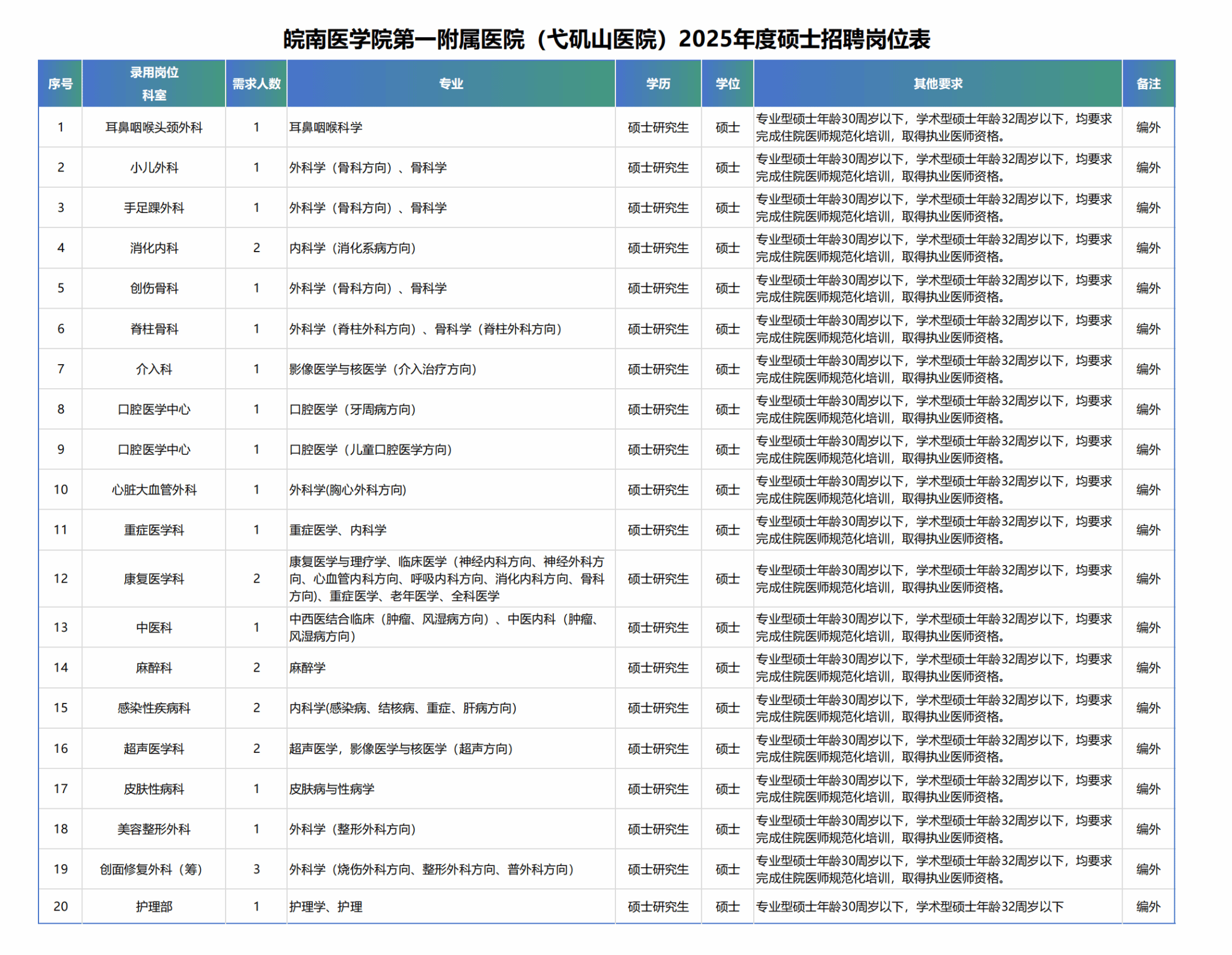 2025年度我院公開招聘碩士共27人,具體崗位信息詳見下表: