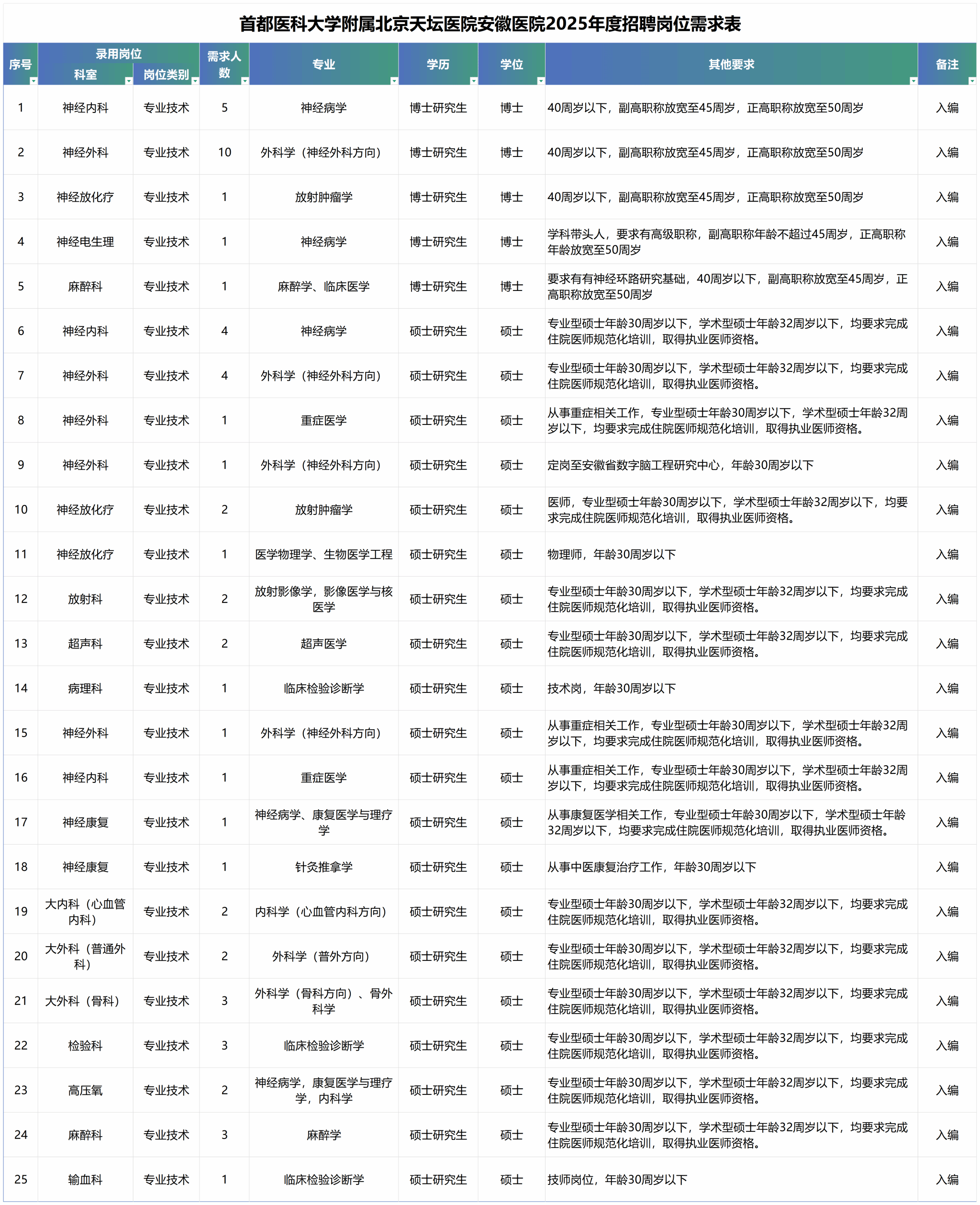2025年度安徽醫(yī)院公開招聘碩士及以上高層次人才56人,具體崗位信息詳見下表: