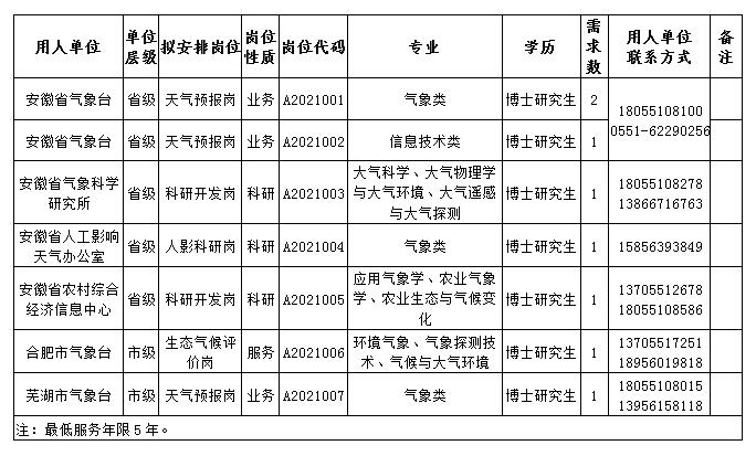 此次招聘崗位為博士崗位。具體單位、崗位、專業(yè)、學(xué)歷要求等詳見《安徽省氣象局2021年度事業(yè)單位博士研究生崗位需求表》。