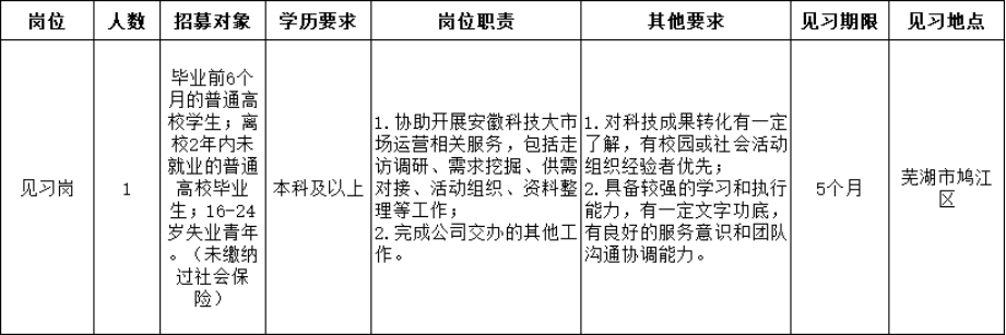 因工作需要,經(jīng)安徽科技大市場建設(shè)運營有限責(zé)任公司研究決定,委托安徽皖信人力資源管理有限公司公開招募1名見習(xí)人員。現(xiàn)就有關(guān)事項公告如下: