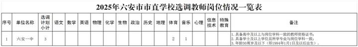 2025-05-09 09:46:55閱讀()安徽省六安第一中學根據(jù)《事業(yè)單位人事管理條例》(國務院令第652號)和《關于開展中小學教職工編制動態(tài)調整工作的通知》(皖編辦〔2021〕337號)精神,結合教育教學需求,經(jīng)研究,決定從市轄縣公開選調教師到六安一中任教,現(xiàn)將有關事項公告如下: