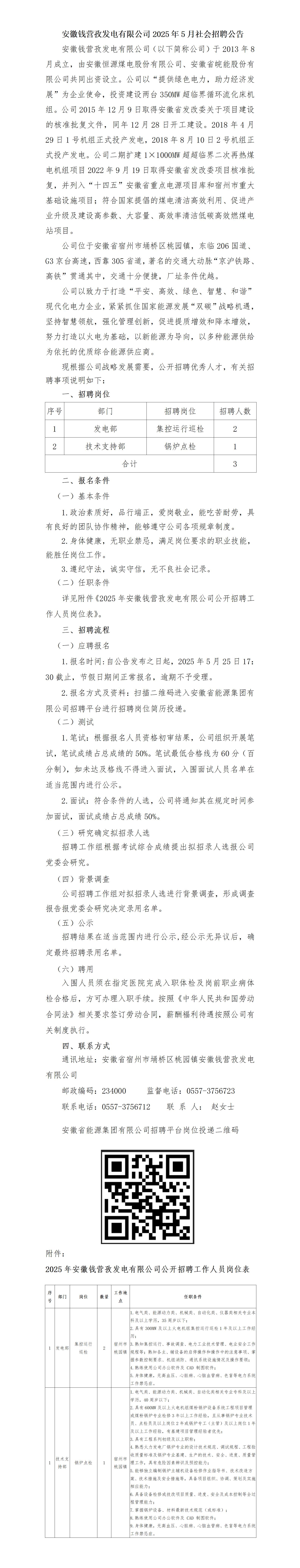 2025年安徽錢營孜發(fā)電有限公司5月社會招聘公告